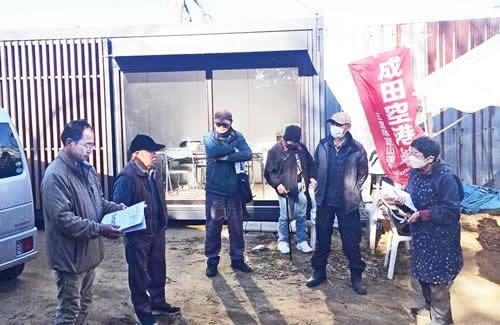 反対同盟と支援連絡会議は2月18日、127回目の空港周辺情宣一斉行動に立ち上がった。午前8時半、成田市天神峰の市東孝雄さん宅コンテナハウス前に集合した仲間は朝の打ち合わせを行った(写真)。最初に、芝山町白枡の伊藤信晴さんが無投票に終わった芝山町議会選挙について解説。続いて裁判事務局が、法理哲二元空港公団用地部課長代理が翌日の耕作権裁判についに証人として法廷に引きずり出される勝利が勝ちとられたことを報告。さらに、東峰の萩原富夫さんが、2月28日に、機能強化工事実力阻止に向けた現地調査と第3滑走路敷地内デモを行うことを確認した。