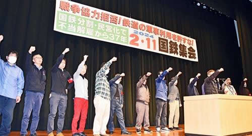 「国鉄分割・民営化で不当解雇から37年 戦争協力拒否! 鉄道の軍事利用を許すな!」2・11国鉄集会が千葉市内で開かれ、460人が集まった(写真)。反対同盟の伊藤信晴さんが連帯あいさつに立った。