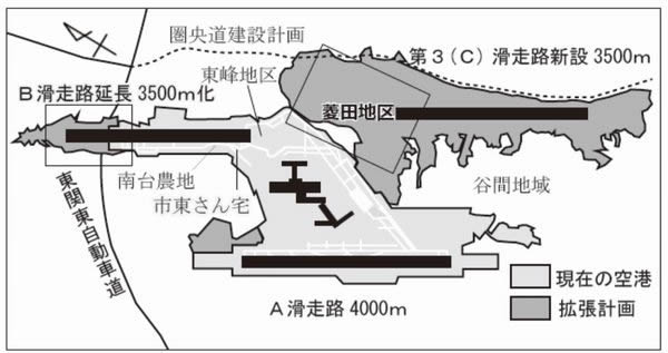 B滑走路は、日韓ワールドカップ開催に間に合わせると称して2002年に2160㍍の暫定滑走路として供用を開始した。これまでも2度にわたる北延伸を行い、ジェット機は東関東自動車道の真上を横切る危険な離着陸を行ってきた。