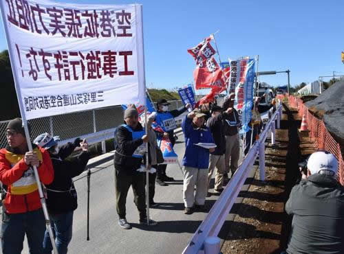 NAAは第3滑走路の準備工事となる菱田地区の高谷川拡幅工事に、昨年12月6日に着手した。総工費は約2億3650万円で今年7月までに完成させるとしている。この日は平日にもかかわらず、デモをおそれて工事は中止になっていた。