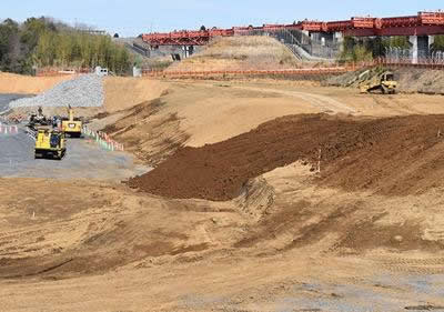 成田空港会社(NAA)の資料によれば、東関道切り回し工事での切土は15万立方㍍、盛土6万立方㍍、北延伸造成工事での切土120万立方㍍、盛土330万立方㍍とされる(東京ドーム一杯が124万立法㍍)。