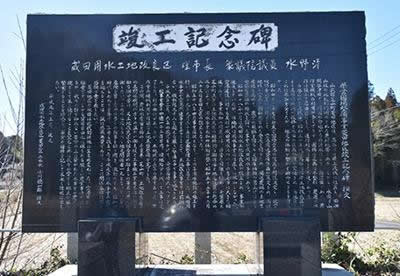 目の前には「成田用水竣工記念碑」が建っている。成田用水事業理事長・水野清衆議院議員の名前で、「菱田地区の水田は近代的耕地に生まれ変わった」「郷土のますますの繁栄を祈念し」などのむなしい文言が刻まれている。