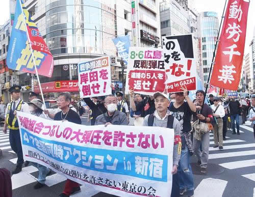 東京では新宿駅東口でリレーアピールの後、新宿駅を一周するデモで「戦争反対、弾圧許すな」と力強く訴えた。