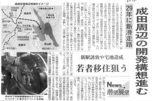 その取り戻しのために、この間のマスコミを使った「新成田空港キャンペーン」が繰り返されている。4月17日付日経新聞は、「29年に新滑走路」「成田周辺の開発構想進む/新駅誘致や宅地造成、若者移住狙う」と報道した。いずれも針小棒大に書き立てた願望記事だ。しかもその内容は、「空港の発展にあぐらをかき、待てば人が来る時代は終わった」「空港がにぎわっても今停滞気味」「空港が拡張しても街の魅力がなければ移住者は増えない」と、周辺自治体に空港にもっと協力することを強制するだけで、展望を示すことができないでいる。