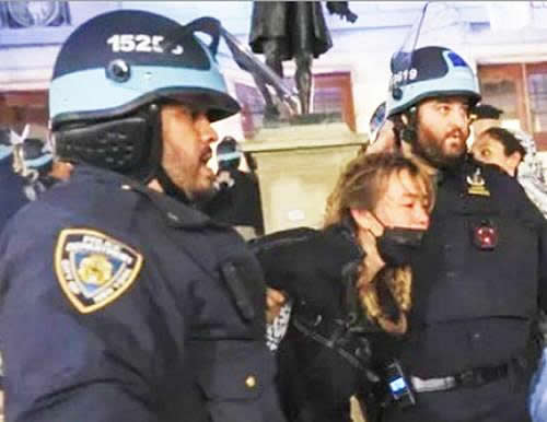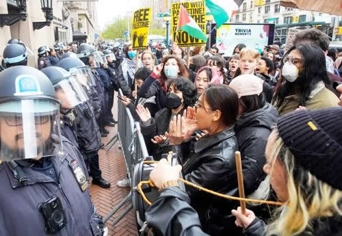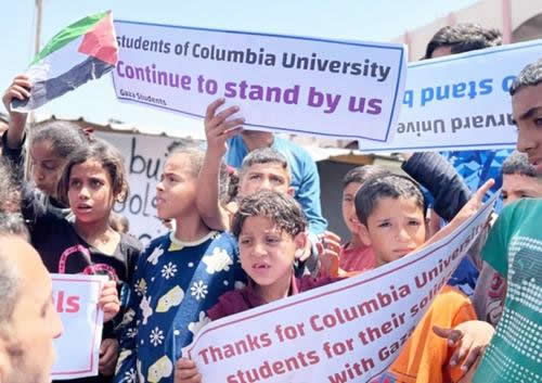 全米の大学に「パレスチナ虐殺今すぐやめろ!」の実力闘争が激化・拡大している。ニューヨークのコロンビア大学で弾圧に差し向けられた警察に猛抗議する学生デモ(4月18日、上)。同大のハミルトンホールを武装占拠し逮捕された学生(5月5日、中)。米学生の決起に感謝の意を表すガザの子どもたち(下)