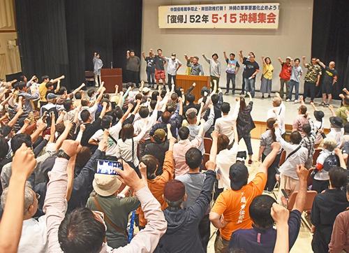 19日、会場を満杯にして「復帰」52年5・15沖縄集会が開かれた。宮古島や石垣島で闘う住民、動労千葉、港合同昌一金属支部、三里塚反対同盟の萩原富夫さんの連帯あいさつ。さらに、8・6ヒロシマ決戦アピール。大坂正明さんを取り戻す会のアピール、全学連の決意表明など、戦時下に突入した今こそ「安保粉砕・全基地撤去」の闘いを自らの手で実現する決意が全発言にあふれた。