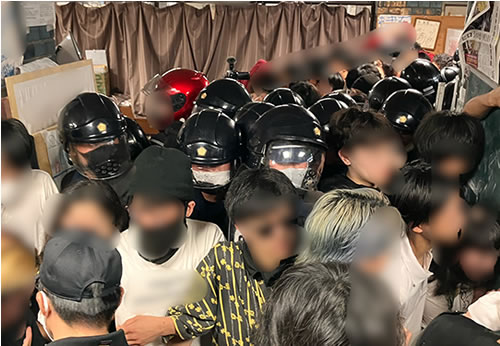 25日には、京都大学熊野寮に対し、令状すら見せずに大量の機動隊が押し入り、抗議する学生に深刻なけがを負わせた暴力的な家宅捜索を強行した(写真は「熊野寮広報局」Xから)。さらに27日、京都府警と警視庁は前進社本社を家宅捜索。