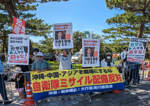 改憲・戦争阻止!大行進沖縄の仲間は6月23日、沖縄全戦没者追悼式に出席した岸田首相を徹底弾劾した。警察、右翼の妨害を跳ね返し、「沖縄を戦場にするな! 岸田は帰れ!」の叫びが会場内外にこだました。