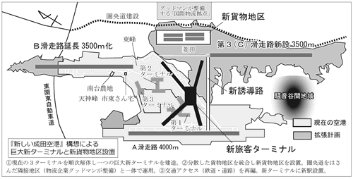 NAAは今、できてもいない第3滑走路を前提にして「『新しい成田空港』構想」なるものを打ち出し、1ターミナル化を唱え、新誘導路建設、貨物地区整備、交通アクセス改変など、既存施設の破壊・撤去と新施設建設を金に糸目をつけず進めようとしている(見積もり8000億円)。それが「完成」する2030年代には、年間で発着数50万回、旅客数7500万人、貨物取扱350万㌧となるとうそぶくが絶対に不可能だ。現在の戦争情勢のもとで、日本帝国主義が成田の巨大滑走路の軍事利用へ突き進むことは明らかであり、それが機能強化と「新しい成田」の本質だ。