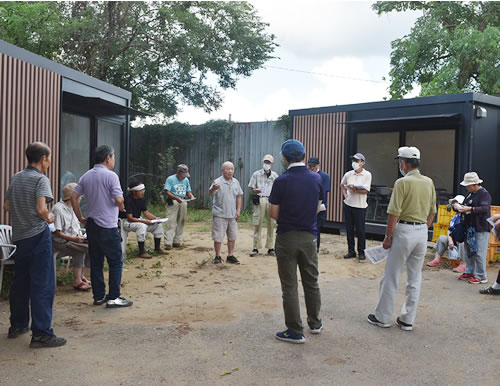 最初に、反対同盟事務局の伊藤信晴さんが芝山町の最新動向と17日横芝光町での騒音問題講演会の報告をして、28日に取り組むフィールドワークを提起した。市東さんは、「暑いので体に気を付けて」と激励のあいさつ。これを受けて各自担当地区のビラ配りに入った。