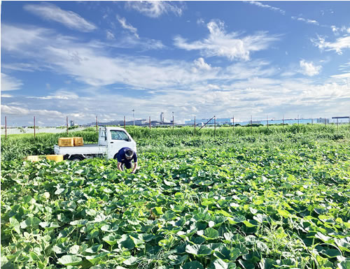 萩原さんの横川の畑で育っているのが坊ちゃんカボチャ。手のひらにのるほどのサイズと坊ちゃん刈りの見た目に反して、ビタミンAは通常の3倍以上。見た目は小粒でも栄養価は高く甘みも強いのです。