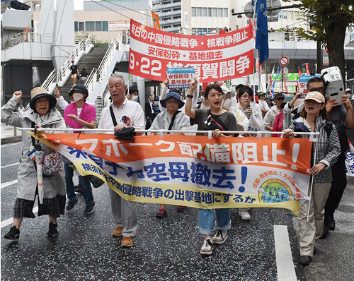 9月22日、改憲・戦争阻止!大行進神奈川の主催で、「米日の中国侵略戦争・核戦争阻止! 安保粉砕・基地撤去!」を掲げた横須賀闘争が闘われた。京急横須賀中央駅前に350人が結集。反対同盟の宮本麻子さんが連帯のあいさつで市東さんの農地死守・軍事空港粉砕を呼びかけた。