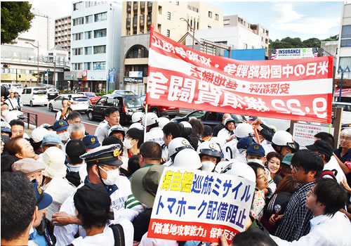 (写真 横須賀基地ゲート前から20㍍まで迫った【22日】)