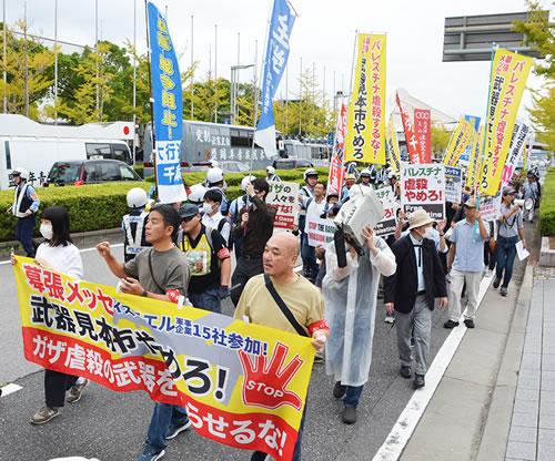 来年5月21〜23日、幕張メッセで「武器見本市・DSEI・JAPAN・2025」が行われる。武器を生産・販売している軍事企業=「死の商人」が世界から281社、パレスチナ大虐殺を行っているイスラエルからも15社が参加する。戦争のための武器見本市に絶対反対し、熊谷俊人千葉県知事の幕張メッセの貸し出しを阻止しよう。改憲・戦争阻止!大行進千葉は、この第1弾の闘いとして幕張メッセ包囲デモを提起した。千葉県下を中心とする労働組合、市民団体が呼びかけにこたえ80人が参加した。