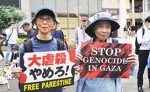 正午から海浜JR幕張駅前でリレートークが行われた。駅コンコースの一角に、「パレスチナ虐殺するな!武器見本市やめろ」の黄色いノボリが林立する。海浜幕張駅周辺は、メッセ会場だけでなく、アウトレットをはじめ巨大な商業施設があり、多くの利用者が行き来する。