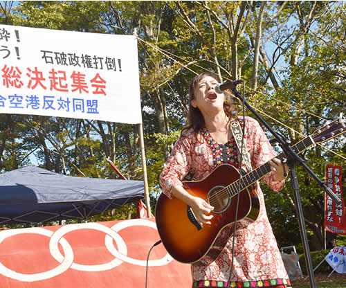 川口真由美さんが登場し、ギター弾き語りでガザの現状を告発する自作曲を歌い、会場を盛り上げた。