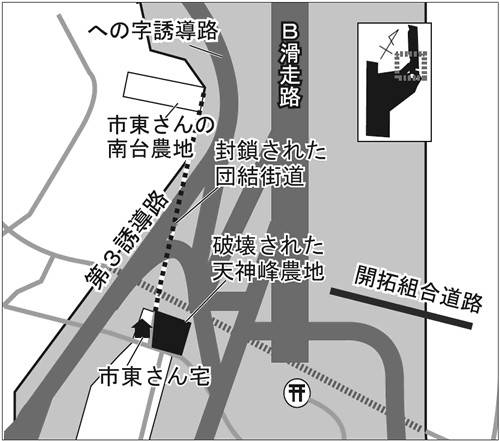 市東さん宅前の天神峰農地とBとE1の土地については、NAAは市東さんとの間で賃貸借関係にあるとして、その契約解除を求め07年に提訴(農地法裁判)。最高裁決定を受け、昨年2月に機動隊の暴力を使って天神峰農地とそこに建つ営農手段・工作物を強制執行で奪いました。