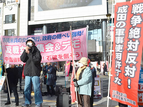 反戦女性集会・デモが12月1日、東京・新宿で行われ、240人が集まった。三里塚芝山連合空港反対同盟婦人行動隊の木内敦子さん、現闘が参加し、木内さんが発言に立った。