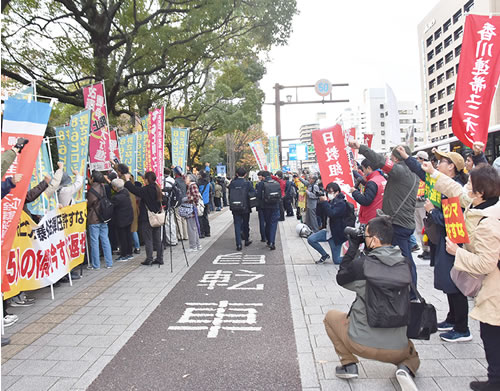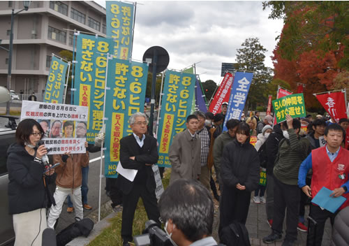 獄内での完全黙秘・非転向の闘いを基礎に、広島地裁に提出した8千筆超の釈放要求署名、500人超の「保釈要求上申書」に示される広範な怒りが裁判所・検察に集中した。決定的だったのは、「年内奪還」を掲げ全国から300人が駆けつけた「12・6広島地裁包囲 怒りの大行動」だ。殺人的に劣悪な環境を居直る広島拘置所。公判を開かず、保釈請求を却下し続けた広島地方裁判所。「被害者」の証人申請すらせず、「事件」をでっち上げた広島地検。平和教材から「はだしのゲン」を削除し、職員研修で教育勅語を称揚する弾圧の先兵・松井市長。これらに対して満身の怒りをもって抗議の声をたたきつけた。