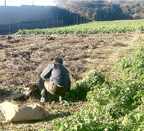 ずいぶんと寒くなってきましたね。このところ、氷点下の朝が続いています。産直の出荷の日に、朝イチで春菊を収穫しようとしたらカチンコチンに凍ってしまっていたので、10時のお茶が終わってから収穫するよう変更するなんてこともありました。これほどでもなくても、朝方は足元から冷えこみます。霜がとけてくると足元が濡れるということもあるので、今からの時期は長靴が必須です。そして、靴下2枚重ねでスタートし、気温の上がりぐあいをみながら、靴下1枚になり、さらに長靴から地下足袋に履き替えるといったようにしています。服も同様で、脱いだり着たりで調節できるように着込んで援農に出発します。特によく晴れた日は一日のうちでも寒暖の差が激しいですし、なおかつ力仕事になるとすぐもう厚着ではいられなくなります。ヒートテックの下着はなかなかの優れモノで寒さ対策の強い味方ですが、ジャケットみたいにパッと脱いだりはできないのが難点ですね。