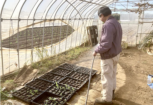 (写真 萩原さんがハウスの苗に水やり【12月16日】)