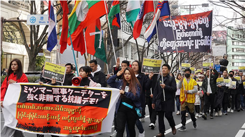 軍事クーデターから4年の2月1日、在日ミャンマーコミュニティー主催の「ミャンマー軍事クーデターを強く非難する抗議デモ」が渋谷で闘われた。青年を先頭に500人が「全ての政治囚を釈放しろ!」「日本政府はミャンマー軍経由の支援やODAをやめろ!」と進んだ。