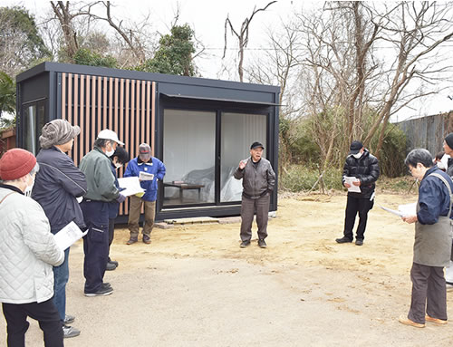 成田市天神峰の反対同盟会議室前に集まった仲間は朝の打ち合わせを行った。この日は曇り空で航空機の音がいつもよりも響き、たびたび会話がさえぎられた。