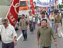 (「暫定滑走路を直ちに閉鎖せよ!」緊急闘争で空港を包囲する反対同盟のデモ隊【6月30日 成田市天神峰】)
