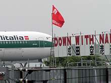 ●天神峰の看板に新たな同盟旗 「Down With Narita Airport」と大書された大看板に新たな反対同盟旗が取りつけられた。同看板と同盟旗は、誘導路を自走する航空機の目に飛び込むのと同時に、小見川県道を東に向かって天神峰トンネルに向かう車からもよく見えアピールしている。(25日=写真)