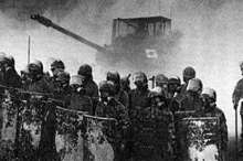 (「戦時体制」下の想定で、反戦派のデモを戦車砲でせん滅・鎮圧する治安出動訓練を行う陸上自衛隊)