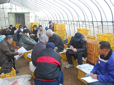 夕方に市東さんの畑のビニールハウスでこの日の行動の集約が行われ、それぞれが自分の訪問先についての報告を持ち寄った。まとめとして萩原進事務局次長が、「今後は後継者となる青年層と話をすることを意識的に追求しよう。住民とここまで話ができるようになったことがこの1年間の成果だと言える。旗開きまでの間にも、それぞれ回れる人はぜひ回って対話を進めてほしい。それが控訴審闘争へ弾みをつける」と提起し、参加者のこの1年の労をねぎらった。