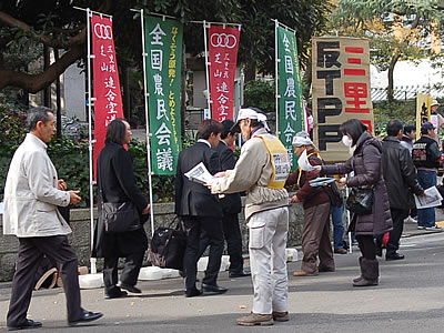 反対同盟と三里塚現闘は12月8日、東京日比谷野外音楽堂で開かれた「これでいいのかTPP 12・8大行動」に参加するとともに、ビラをまいて市東さんの農地裁判控訴審の訴えを行った。