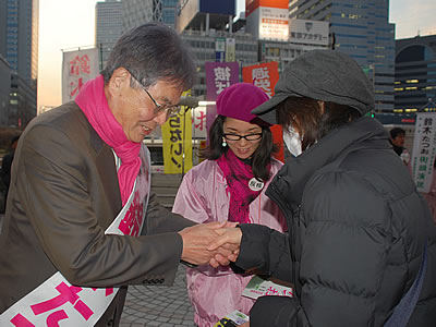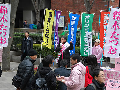 (写真 都知事選決戦で奮闘する鈴木たつおさん【2月1日 新橋】)