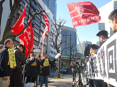 JRはそれまでの「反論など必要ない」という態度から一転して具体的な事実をめぐって反論せざるをえなくなり、、かつ偽装請負の問題については関係ないと開き直った。違法の外注化なら、今すぐ業務と仲間をすべてJRに戻さなければならない。また、2・3ライフサイクル撤廃闘争では、千葉運転区支部の北嶋君が、ライフサイクルで千葉駅に配転されて丸3年を迎えたにもかかわらず、JR千葉支社は満期日の復帰を拒否しようとしていることを弾劾した。