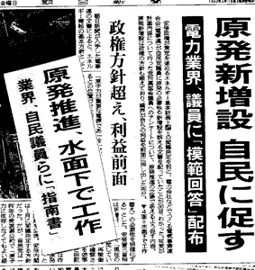 東京電力などで作る電気事業連合会(電事連)が、自民党議員を対象に、原発の新設・増設を促す文書を配布していたことが判明した。(1月31日付 朝日新聞)