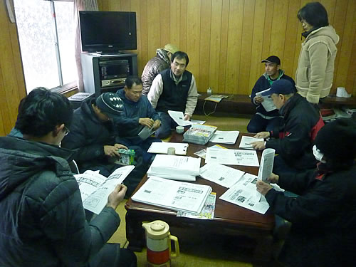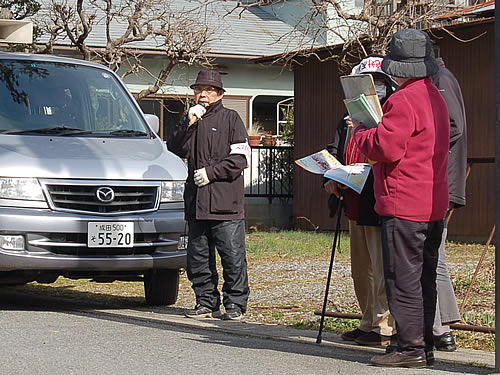 反対同盟は2月16日、第10回目の周辺地域一斉行動に立ち上がった。市東孝雄さん宅離れに集合して行う打ち合わせも息が合ってきた。
