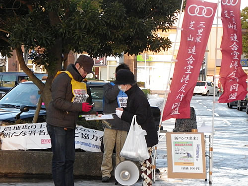 (写真 周辺地域一斉行動で、辻立ち演説を行う北原事務局長。北原さんはこの日、いつもの2倍にあたる8カ所で演説した【2月16日 成田市三里塚】)