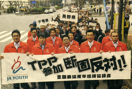 全国農協青年組織協議会は2月13日、東京日比谷公会堂で全国大会を開いた。そこで「『脱退も辞さない』不退転の覚悟でTPP交渉に臨むこと」を要求する特別決議を採択し、1千人が国会まで「TPP参加断固反対」を掲げたデモ行進を貫徹した。