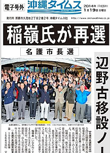 (写真 名護市長選で稲嶺氏の当選を報じる沖縄タイムス号外【1月19日】)