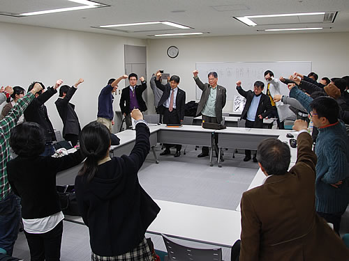 (写真 無罪判決をかちとり、弁護士会館で総括集会【2月12日】)