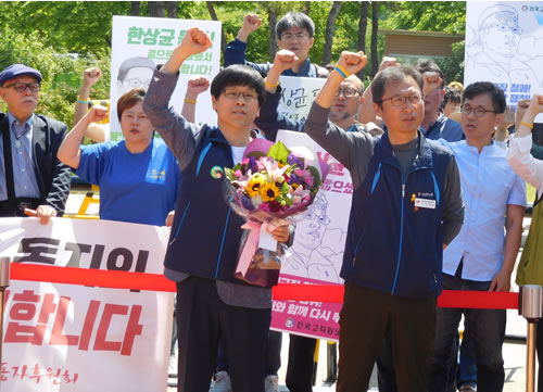 2015年11月、ハンサンギュン委員長(当時)は、パククネ政権のもとで民主労総をはじめとした労働者民衆が「ひっくり返そう世の中を!」をスローガンに立ち上がった「民衆総決起」の先頭でゼネストを組織して闘った。そして、この闘いをはじめ13件の集会を主導した容疑で同年12月10日に拘束され、昨年5月には最高裁判所で懲役3年の刑が確定していた。