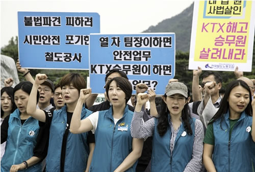(写真 「私たちの歳月を返せ」——解雇撤回を求めて大統領府の前で記者会見を行うKTX解雇乗務員たち【6月4日 ソウル】)