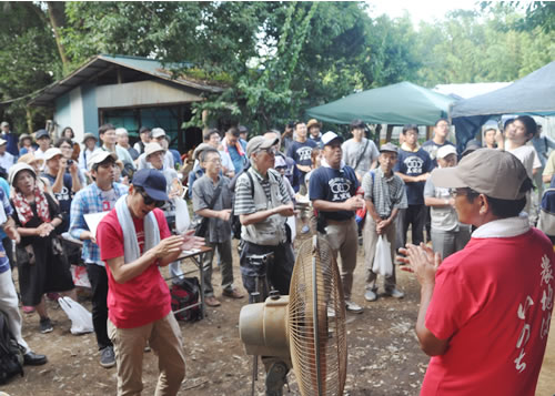 到着地は、市東さん宅向かいの「天神峰農地」。この畑も強制執行の対象地であり、まつりの会場はその一角だ。年輪を重ねた樫の木がそびえ立ち、そのもとに離れ(決戦本部)、作業場、農機具置き場などが存在する。すでに午前中から、同盟・支援総出で会場作りがされていた。