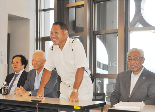 (写真 裁判後の集会で決意を語る市東孝雄さん。左から内藤光博さん、石原健二さん、市東さん、葉山岳夫弁護団長【7月17日 千葉市】)