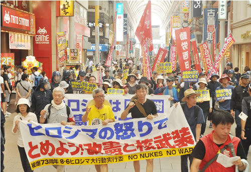午後3時から「改憲と核戦争をとめよう!8・6ヒロシマ大行進」が行われ、猛暑の広島市内を元気に進むデモ隊に沿道の注目と声援が集まった。