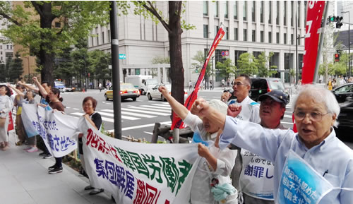 旭非正規職支会支援共闘会議は7月27日、韓国・クミ(亀尾)市で解雇撤回へ闘う旭非正規職支会との同日行動として、東京・新丸の内ビルのAGC(旭硝子が社名変更)本社に対する抗議申し入れに立った。