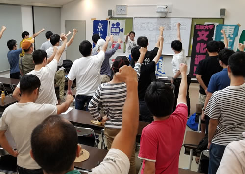 京都大学では立て看板規制をめぐる攻防を突破口に、大衆的な闘いが大学当局を追い込んでいます。高原君は、実質的に改憲が行われている大学の情勢を変えるのは原則的な闘争だと強調しました。改憲問題を焦点に学生を組織し、いざとなれば京大反戦バリケードストライキのようにストライキで立ち上がる決意を固めることを呼びかけ、そのための団結をつくる最高の場として9・1〜2全学連大会への組織化を訴えました。