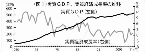 日本の実質成長率の推移をみると(図1)、90年のバブル崩壊以降は低成長が続き、2008年のリーマンショック・大恐慌でマイナス成長に転じ、その後は一層の低成長に陥っている。24年の名目GDP=国内総生産が初めて600兆円を超えたというが、物価上昇の影響を除いた実質GDPは557兆円で、前年比伸び率は0・1%増に過ぎない。GDPの半分以上を占める個人消費は名目で2・2%伸びたが、これも実質では微減だ。GDPも消費も実質では伸びがゼロに近い。「経済成長」など誰も実感しないのは当然だ。