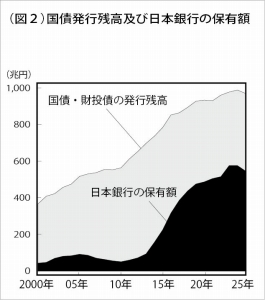25年3月末の国債残高は1054兆4760億円(時価総額)で、長期国債(償還期間1年以上の国債)の残高のうち51・7%の545兆5980億円を日銀が保有している(図2)。25年のGDPに対する政府総債務の比率は249%となる見通しで、米国124%、英国104%などの倍以上である。