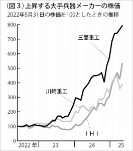 こうした状況で、日帝ブルジョアジーの「唯一の希望」となり、にわかに「活気づいている」のが軍需企業、軍需生産である。「安保3文書」(日帝支配階級自身は「戦略三文書」と呼ぶ)が出された翌年の2023年、日本の大手兵器メーカーの国内受注は前年の2~4倍になった。戦前の財閥時代からの最大の軍需企業・三菱重工の24年度防衛・宇宙事業の受注高は過去最高水準の1兆8768億円、売上収益も8276億円で最高額を更新した。株価も25年には22年から約8倍以上に急騰した(図3)。日英伊による次期戦闘機の共同開発は30年の初飛行を目指しており、三菱重工が設計・製造の中核を担う。原子力潜水艦の保有検討も重要事態だ。フィリピンへの護衛艦6隻の輸出契約、インドネシアへの高速警備艇の供与、オーストラリアとの新型フリゲート艦の共同開発など、本格的な武器輸出も加速する。